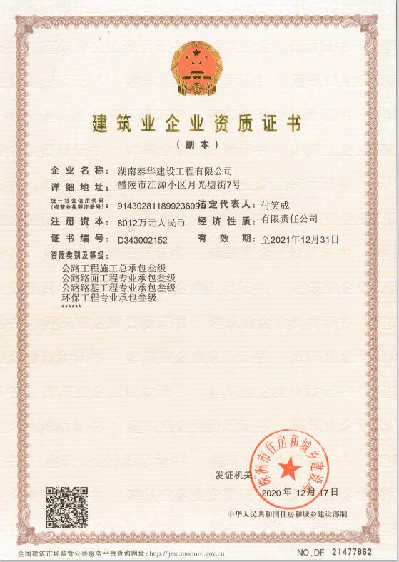 湖南泰華建設工程有限公司一家房屋建筑工程施工總承包貳級,水利水電工程施工總承包貳級,市政公用工程施工總承包貳級,鋼結構工程施工專業承包二級,消防設施工程專業承包貳級,建筑裝修裝飾工程專業承包貳級;公路工程施工總承包叁級,鋼結構、體育設施、環保工程、公路路面工程、公路路基工程專業承包叁級企業。…